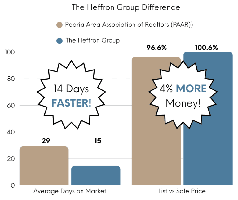 At The Heffron Group, our listings consistently sell 14 days faster and for 4 % more money on average than the Peoria Area Association of Realtors market average. That means: